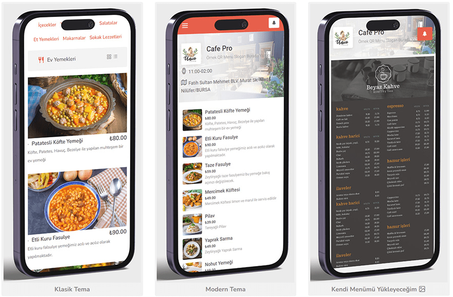 3 Farklı QR Menü Temasıyla Fark Yaratın, Telefon ve tabletlerle tam uyumlu temalarımız arasından dilediğinizi seçin, menünüzü markanıza en uygun şekilde sunun. Tema değişikliklerini istediğiniz zaman zahmetsizce yapabilir, isterseniz kendi tasarımınızı “Kendi Menümü Yükleyeceğim” seçeneğiyle kolayca ekleyebilirsiniz. Her içerik veya fiyat güncellemesinde yeni karekod oluşturmanıza gerek kalmadan menünüzü anında güncelleyebilirsiniz. 📢 Üstelik yepyeni temamız çok yakında yayında!